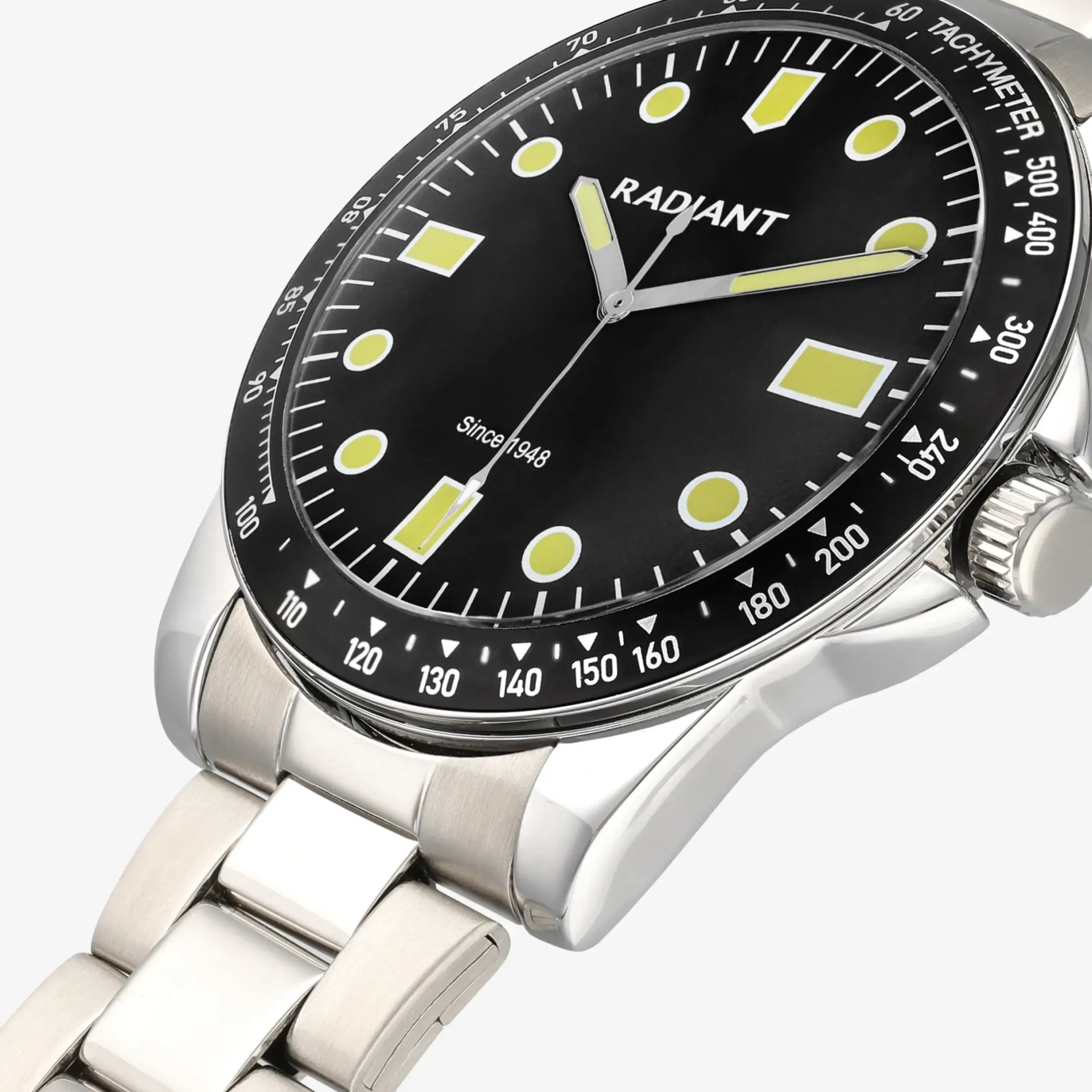 A sua caixa de 43 mm em metal polido, juntamente com a bracelete de elos metálicos, cria uma silhueta robusta, enquanto o mostrador preto com marcadores amarelos confere uma estética funcional e contemporânea.